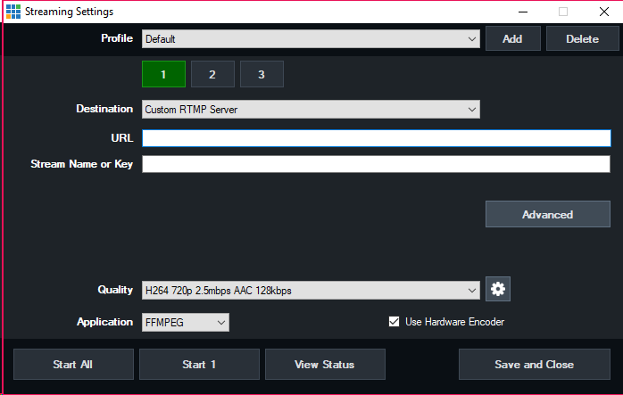 Up to three streaming destinations can be used by selecting the 1,2 and 3 buttons at the top of the Streaming Settings window.