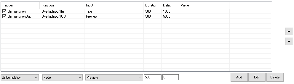 Triggers that use the same triggering name (such as OnTransitionIn) will run one after the other in the order that they are listed. In the example below, the OverlayInput1 function will be triggered 5 seconds after the ‘Input 1: Sample Video’ has transitioned to the main screen, and then an additional 2 seconds after this, the OverlayInput2 function will be triggered.