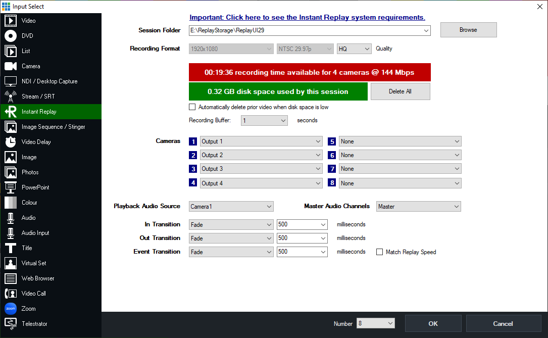 Select any Camera input already added to vMix here, if you add an input later on you can revisit this configuration window by clicking the cog icon in the Instant Replay Controller window.