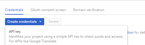5. Click the Create credentials button and select API key