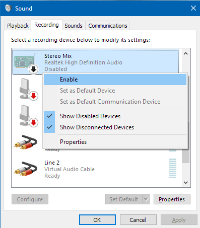 3. A new item called "Stereo Mix" should appear in the list. Right click this and click Enable.