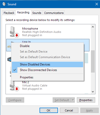 2. Select the Recording tab then right click in the window and click "Show Disabled Devices"