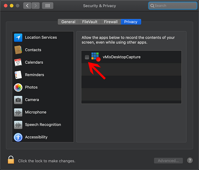 This privacy setting should now be ticked. Close this window and then re-open the vMix Desktop Capture for Mac app to continue.