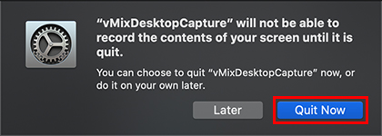 If the vMix Desktop Capture app is still open, it will prompt you to quit the app to proceed with these changes. Click the Quit Now button.