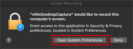 You will then see a window asking permission for vMix Desktop Capture to record this computer's screen. Click the Open System Preferences button to enable this option: