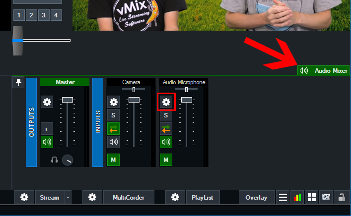 After adding your camera and audio inputs in vMix, go to the Audio Mixer tab at the right of vMix. Then click on the settings button (cog icon button) on your audio input.