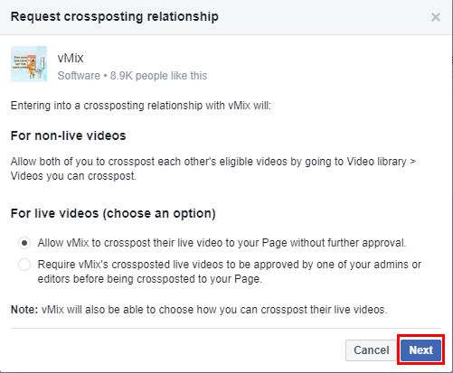 A window will appear. Under the section for live videos you can choose to either allow the other page to crosspost their live video without approval. Or choose to approve it first each time the other page starts a live video (stream). Once you have chosen your preference, click Next.