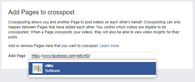 Once the admin of the other page visits this unique URL, they will see a similar window where they can choose their crossposting preferences for live videos. Once the options have been chosen, select Add.