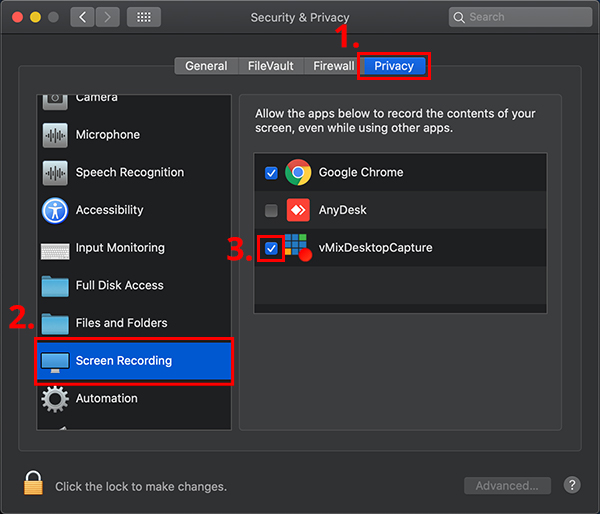 Select the Privacy tab at the top. Then select the Screen Recording option in the left sidebar. From here tick the checkbox next to the vMixDesktopCapture option. Or if it is already ticked, untick it and tick it again. Then close this window.