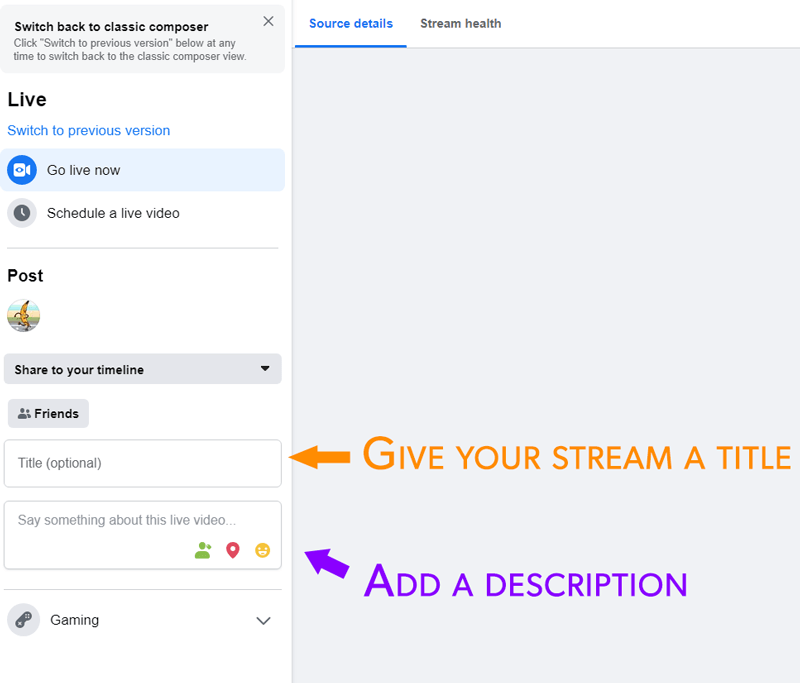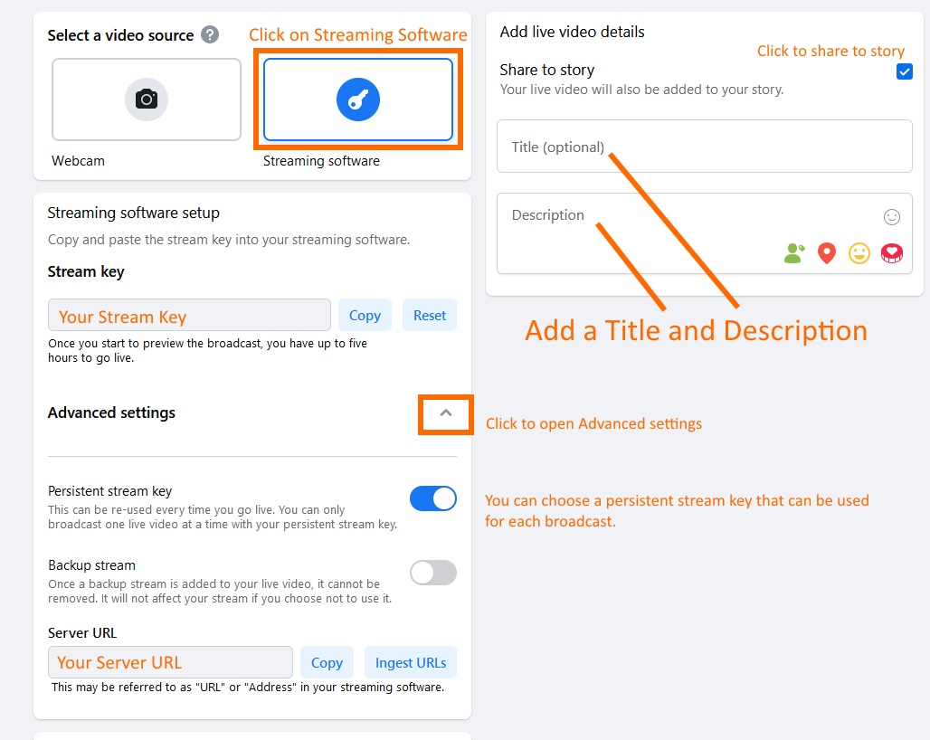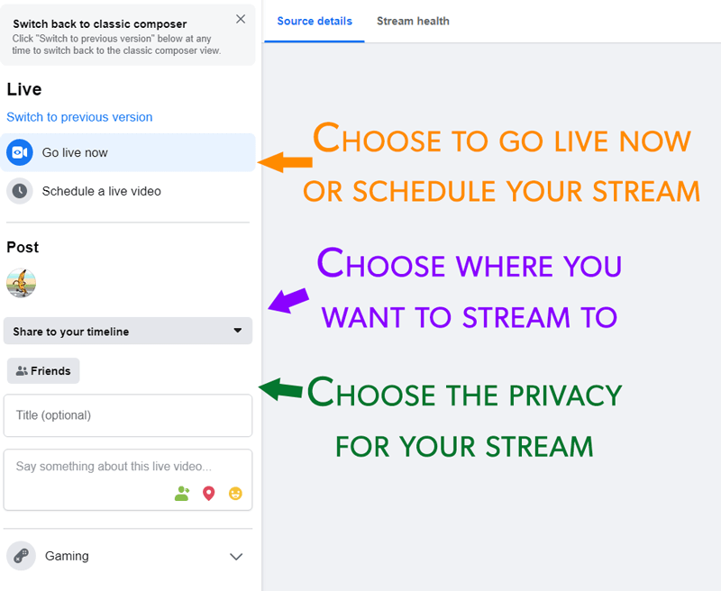 To stream to Facebook manually, please follow these steps. If you're using an older version of the Facebook Producer, there are more instructions below.