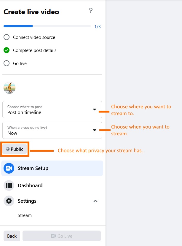 Next you'll need to select where you are streaming to, when you're going to stream and then choose the privacy for the stream.