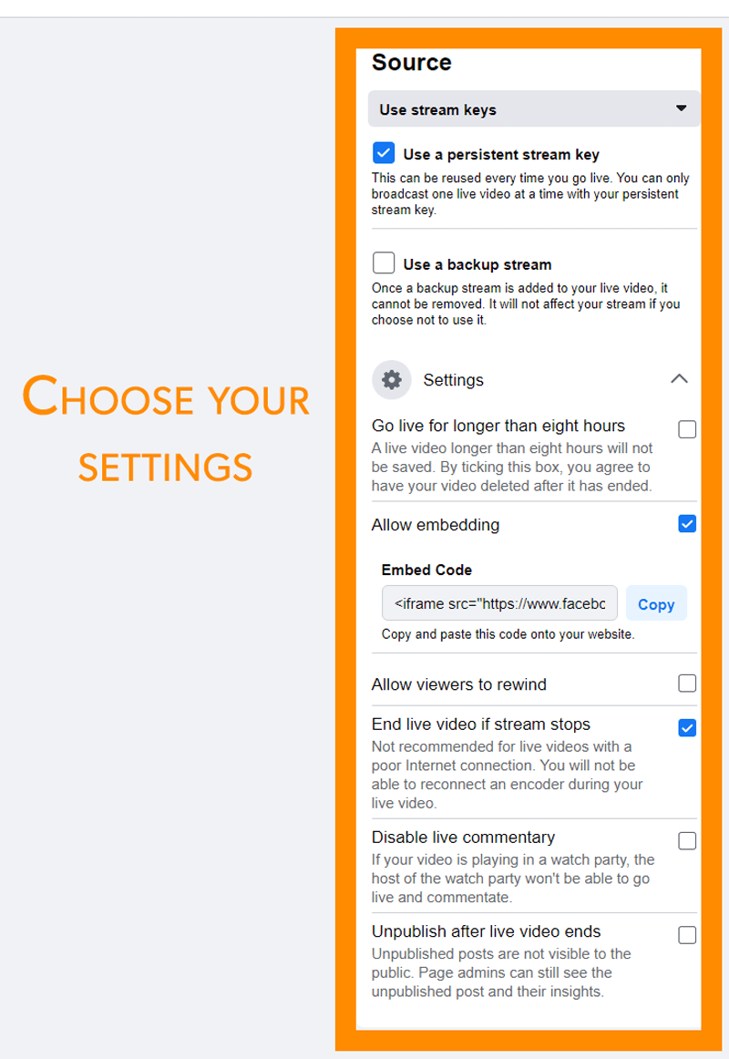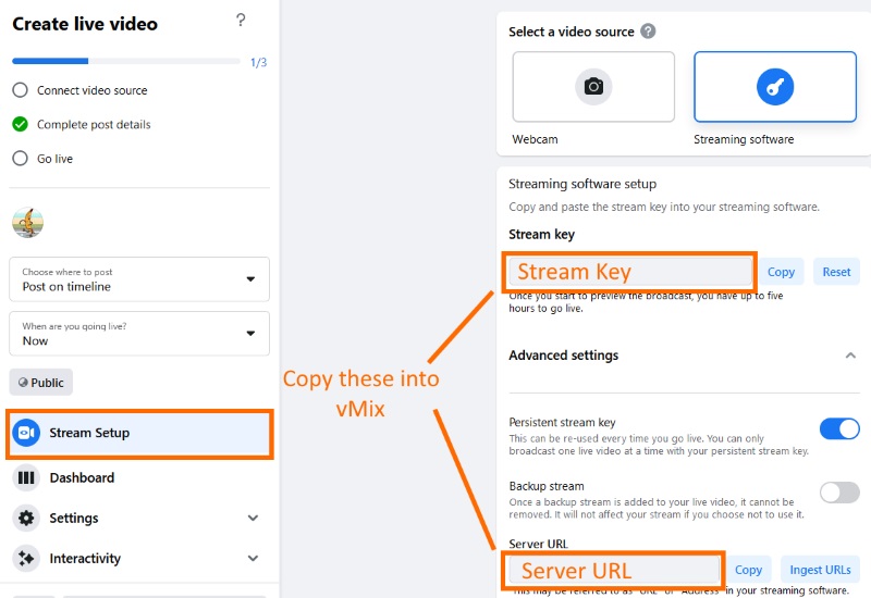 You can also choose other settings like whether you want to use a persistent stream key, which means you don't have to enter the key each time into vMix when you want to setup the stream.