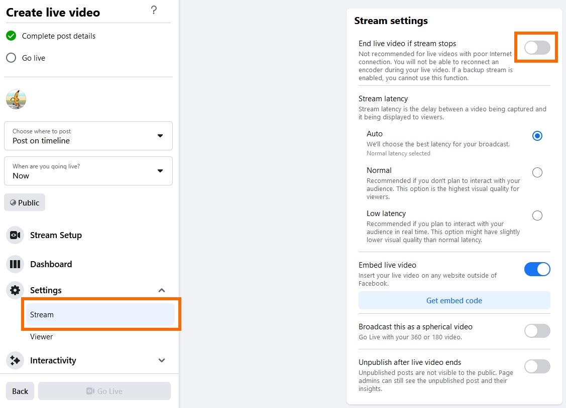 Next click on Stream under setting and turn off the option to End live video if stream stops. You can can adjust your stream's latency here and grab an embed code.