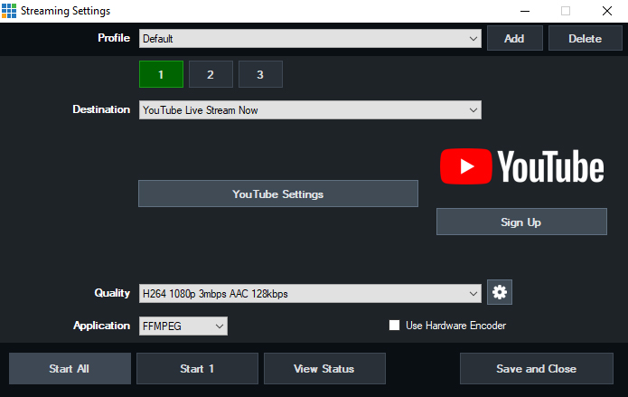 Choose Youtube Live Stream Now from the Destination dropdown menu. Click YouTube Settings button to setup your Stream.