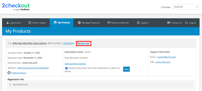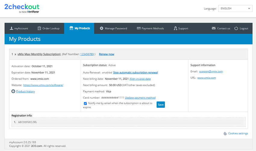 All vMix software sales and subscriptions are handled by our payment provider - 2Checkout. In order to manage your subscription including how to renew or enable auto-renewals on your vMix Max subscription, please login to your 2Checkout account portal.