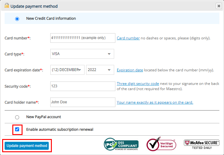 A pop up window will appear asking you to choose your payment method (Credit Card or PayPal). Fill in your payment information. Then make sure you tick the checkbox called Enable automatic subscription renewal before clicking the Update payment method button to save.
