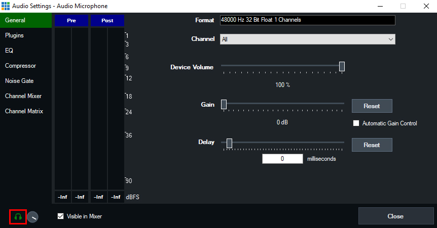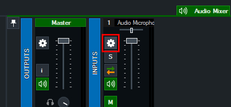 After adding your Microphone input into vMix, go to the Audio Mixer over to the right. Find your microphone input and click the cog/gear icon to open the settings.