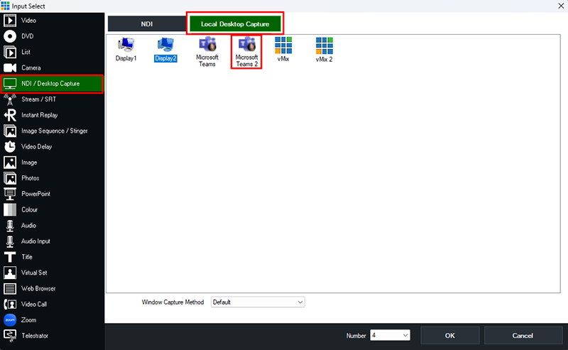 Once your guests have joined your Teams meeting or Video Call, we can now add them into vMix. To add the video, select the Add Input button from the bottom left corner. Then select the NDI / Desktop Capture tab. Choose the Local Desktop Capture button from the top. From here, select Microsoft Teams. Often it will be Microsoft Teams 2 depending on how many windows you have open in Teams. Select one till you find the correct one showing your meeting/call.