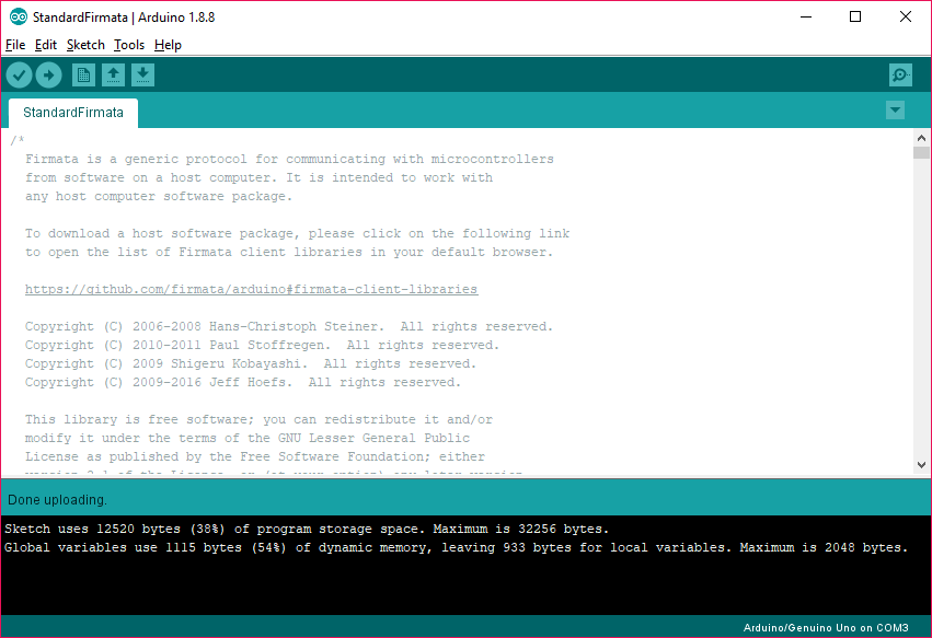 Go to File -> Examples -> Firmata -> StandardFirmata to open the StandardFirmata firmware.