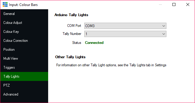 For the inputs that need tally lights setup, click the cog icon underneath them and go to the Tally Lights tab in Input Settings.