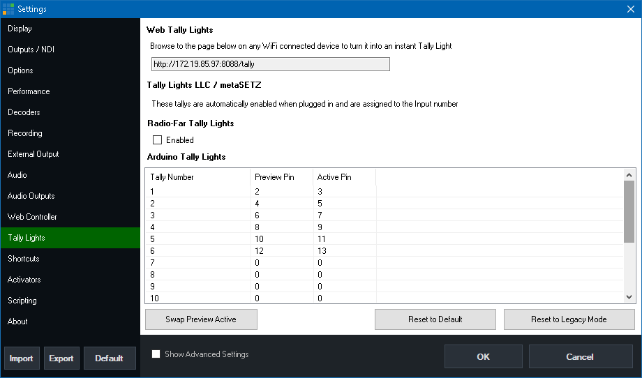 Go to Settings -> Tally Lights. This will display the pin mappings for Preview and Active (Program) to connect your LED tally lights to on the board.