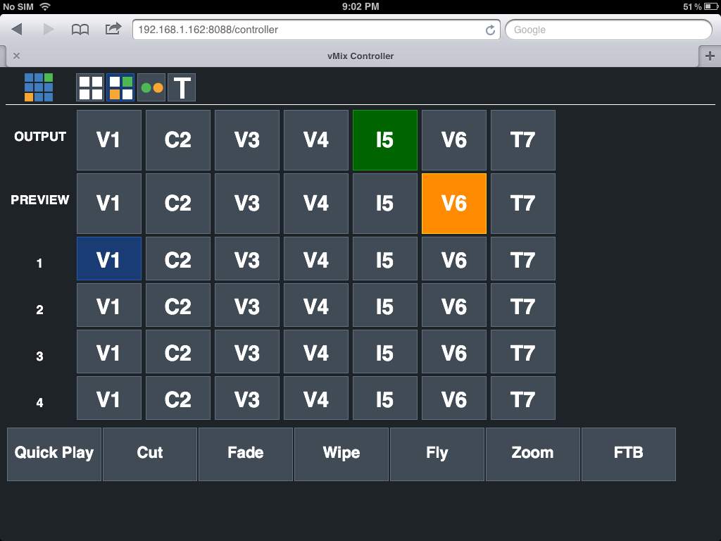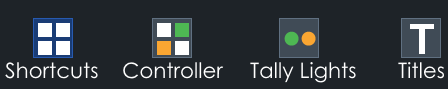 The vMix Web Controller interface is a compact version of your actual vMix interface. It is compact so that it can be used on even the smallest of Smartphone screens. The interface has 4 different screens- Shortcuts, Controller, Tally Lights and Titles. These can be changed by clicking the icons along the top.